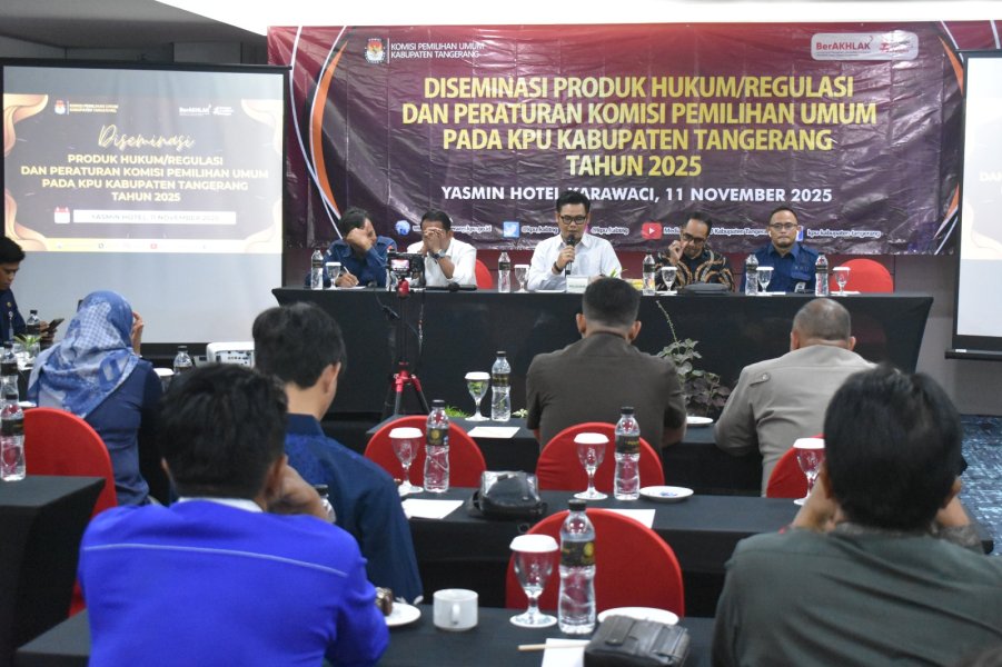 Tangerang, - kab-tangerang.kpu.go.id – Komisi Pemilihan Umum (KPU) Kabupaten Tangerang melaksanakan kegiatan Diseminasi Produk Hukum dan Peraturan Komisi Pemilihan Umum, Selasa (11/11/2025), di Yasmine Hotel, Curug. Kegiatan ini dibuka secara resmi oleh Ketua KPU Kabupaten Tangerang Muhamad Umar, didampingi para Komisioner, Sekretaris, serta Kepala Subbagian Teknis Penyelenggaraan Pemilu dan Hukum.