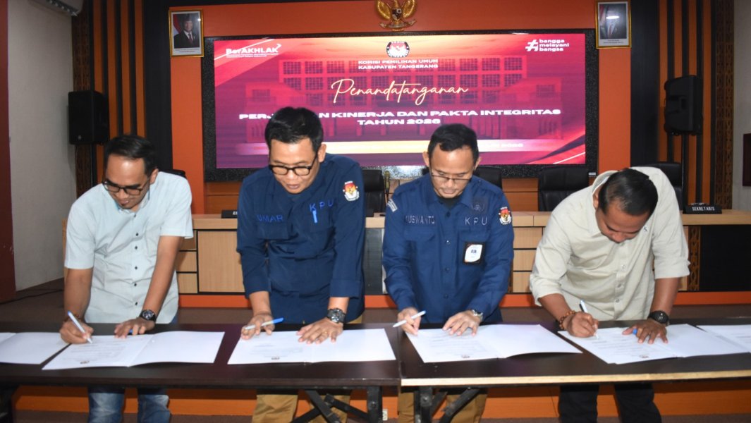 Komisi Pemilihan Umum (KPU) Kabupaten Tangerang melaksanakan penandatanganan Perjanjian Kinerja Tahun 2026 serta Pakta Integritas yang digelar di Aula Kantor KPU Kabupaten Tangerang pada Selasa, 20 Januari 2026.