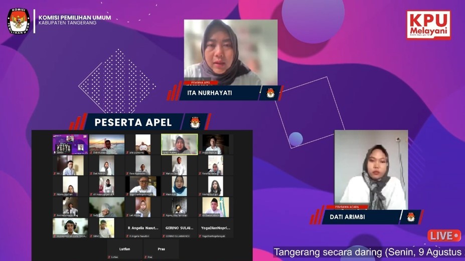 Tigaraksa, (www.kab-tangerang.kpu.go.id) - Apel pagi setiap hari Senin memang rutin dilaksanakan di lingkungan Komisi Pemilihan Umum Kabupaten Tangerang. Seperti halnya pagi ini, Senin 9 Agustus 2021 KPU Kabupaten Tangerang mengadakan apel pagi, kali ini apel dilaksanakan secara daring via Zoom Meeting, apel diikuti oleh seluruh staff sekretariat, dimulai pada pukul 07.30 WIB. Sebagai Pembina apel kali ini adalah Ita Nurhayati selaku Komisioner KPU Kabupaten Tangerang.
