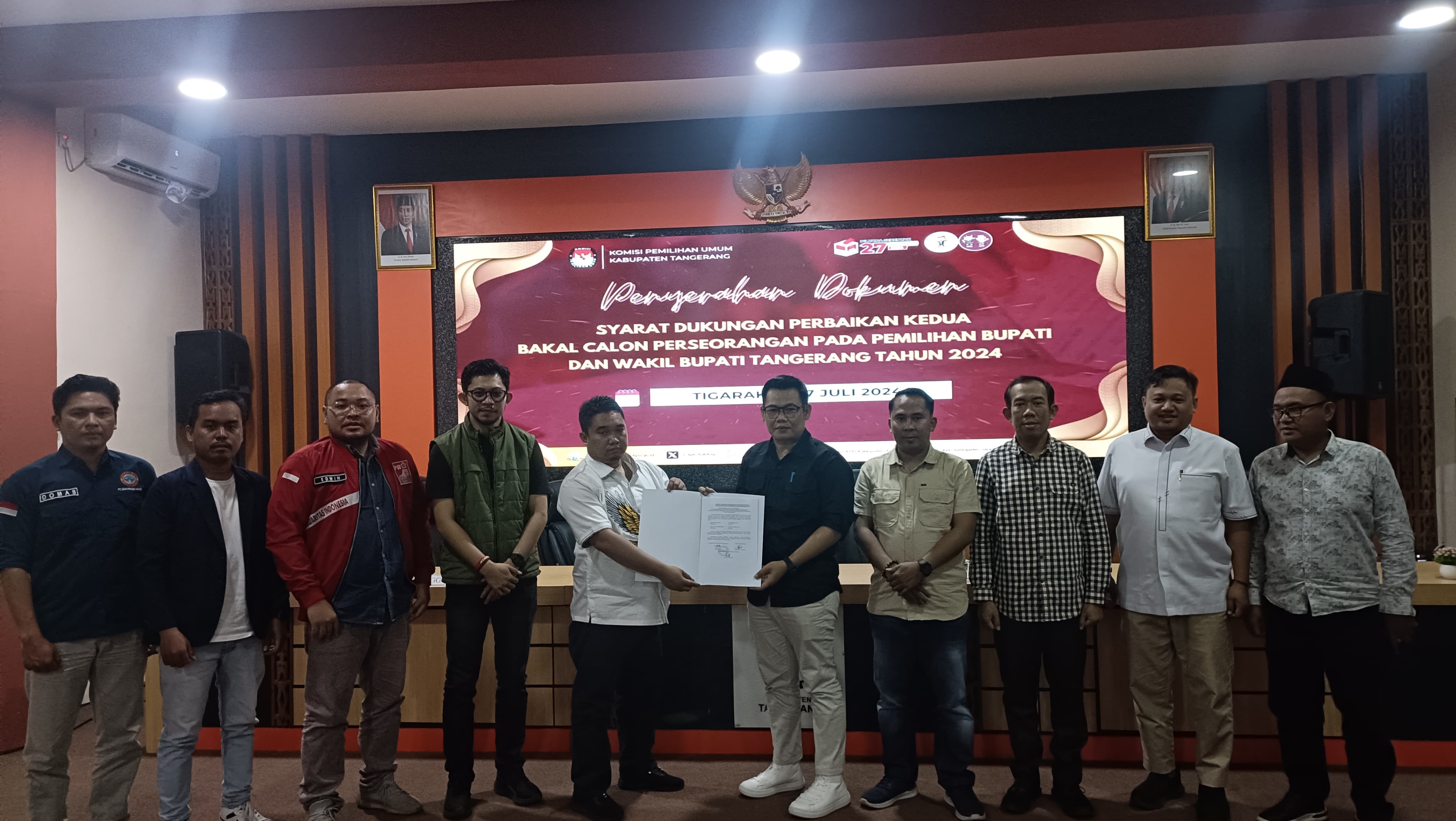 Tigaraksa, (www.kab-tangerang.kpu.go.id) – Komisi Pemilihan Umum (KPU) Kabupaten Tangerang melaksanakan Penerimaan Penyerahan Dokumen Syarat Dukungan Perbaikan Kedua Bakal Calon Perseorangan pada Pemilihan Bupati dan Wakil Bupati Tangerang Tahun 2024, bertempat di Aula KPU. Rabu, (17/7/2024).