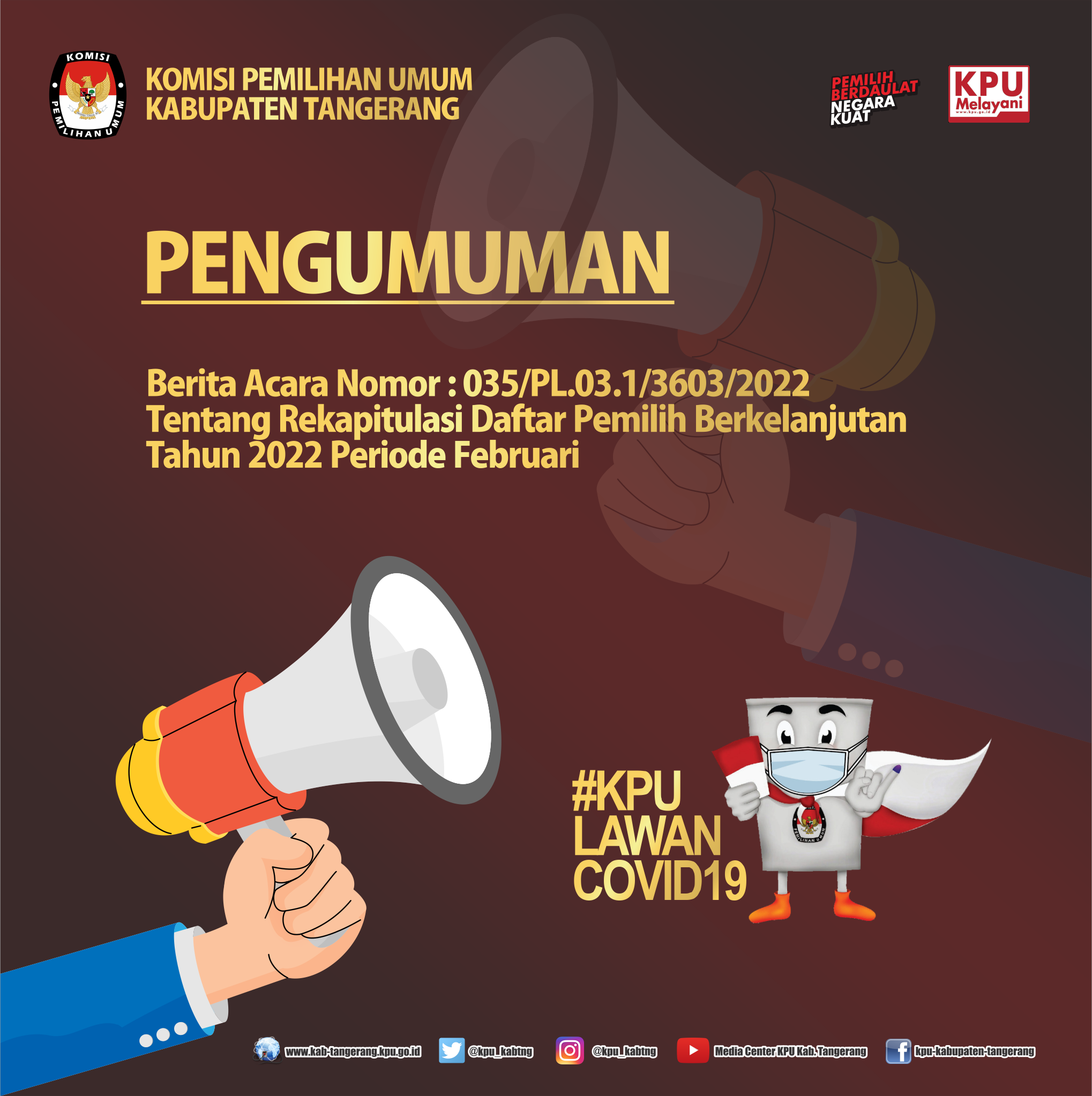 Berdasarkan Berita Acara Nomor : 035/PL.03.1/3603/2022 Tentang Rekapitulasi Daftar Pemilih Berkelanjutan Tahun 2022, hasil rapat Koordinasi rekapitulasi yang dilakukan KPU Kabupaten Tangerang menghasilkan sebagai berikut :