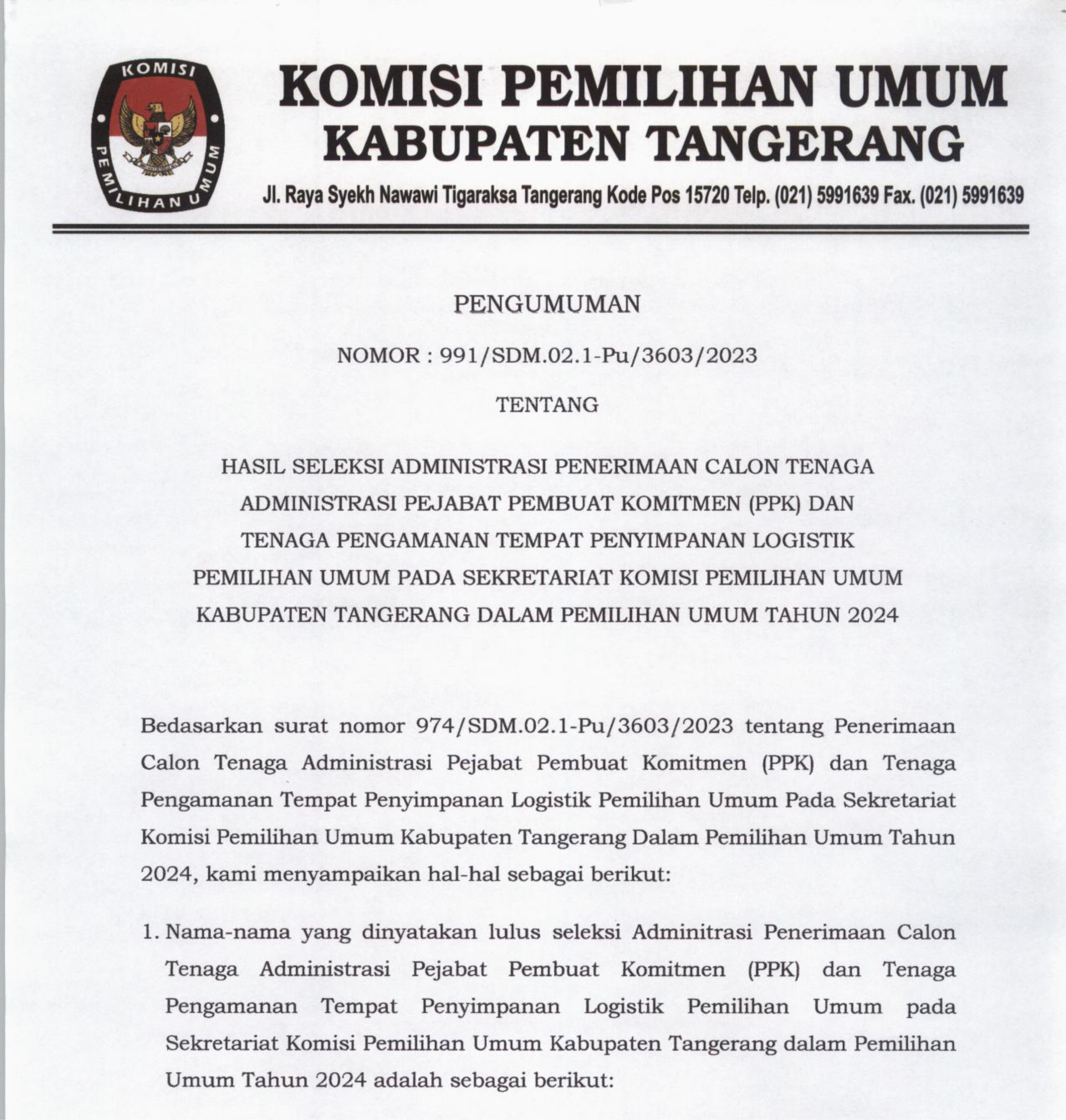 Hasil Seleksi Administrasi Penerimaan Calon Tenaga Administrasi Pejabat Pembuat Komitmen (PPK) dan Tenaga Pengamanan Tempat Penyimpanan Logistik