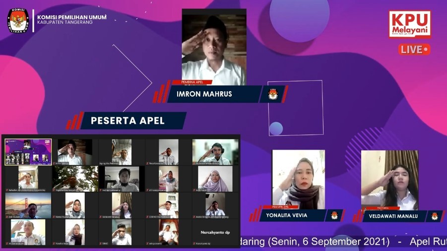 Tigaraksa, (www.kab-tangerang.kpu.go.id) - Apel pagi setiap hari Senin rutin dilaksanakan di lingkungan Komisi Pemilihan Umum Kabupaten Tangerang. Pagi ini, Senin 06 September 2021 KPU Kabupaten Tangerang mengadakan apel pagi, kali ini apel dilaksanakan secara daring via Zoom Meeting, apel diikuti oleh komisioner dan sekretariat KPU Kabupaten Tangerang, dimulai pada pukul 07.30 WIB. Sebagai Pembina apel hari ini adalah Imron Mahrus selaku Komisioner KPU Kabupaten Tangerang.