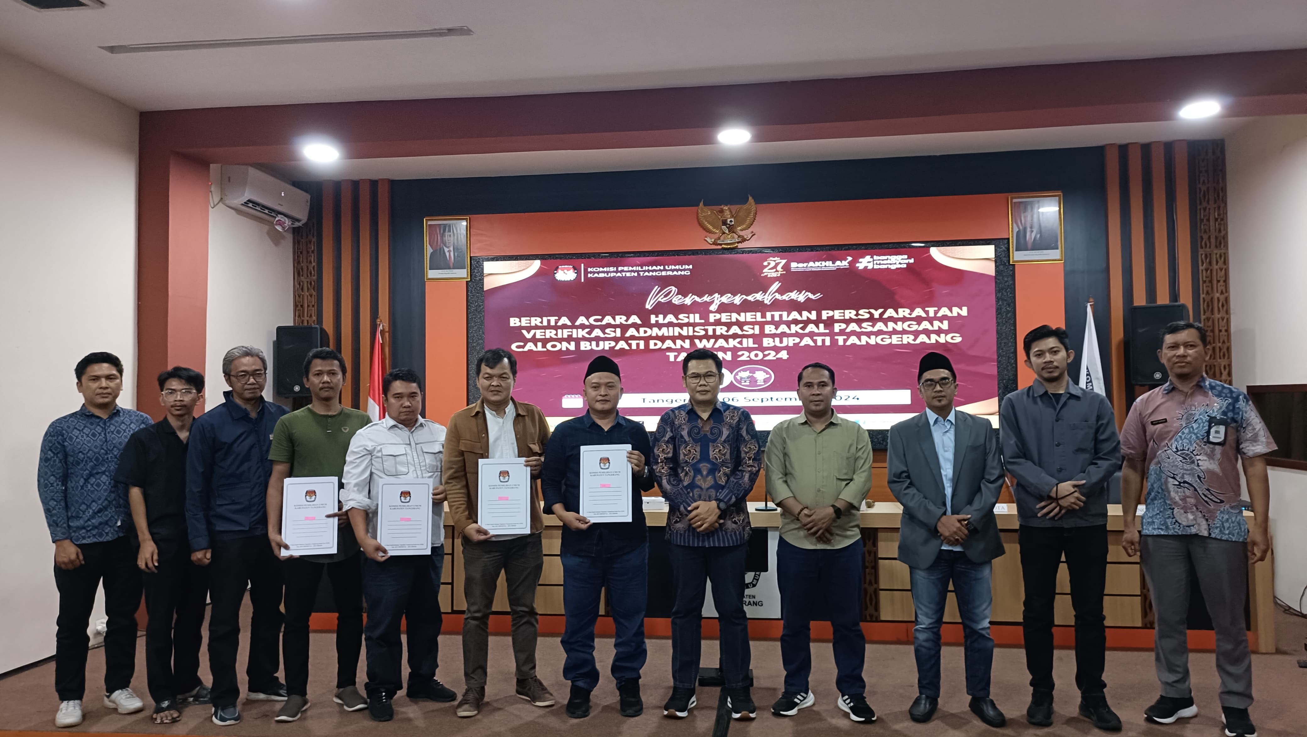 Tigaraksa, (www.kab-tangerang.kpu.go.id) - Komisi Pemilihan Umum (KPU) Kabupaten Tangerang menyerahkan berita acara hasil verifikasi persyaratan administrasi bakal pasangan calon bupati dan wakil bupati Tangerang untuk Pilkada 2024. Bertempat di Aula KPU Jum’at, 06/09/2024.
