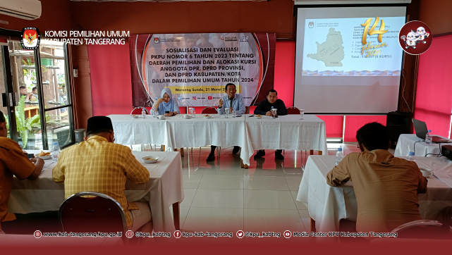 Cikupa, (www.kab-tangerang.kpu.go.id) - Komisi Pemilihan Umum (KPU) Kabupaten Tangerang melakukan Kegiatan Sosialisasi Peraturan KPU Nomor 6 Tahun 2023 tentang Daerah Pemilihan dan Alokasi Kursi Anggota DPR, DPRD Provinsi, dan DPRD Kabupaten/Kota dan Evaluasi PKPU Nomor 6 Tahun 2022 dalam Pemilihan Umum Tahun 2024. Waroeng Sunda, Selasa, 21/03/2023.