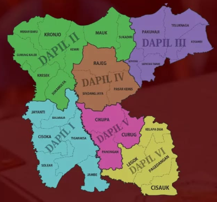 - Dapil 1 terdiri dari 6 Kecamatan (Tigaraksa, Jambe, Cisoka, Solear, Jayanti, Balaraja) dari 6 Kecamatan ini memiliki alokasi 10 Kursi.