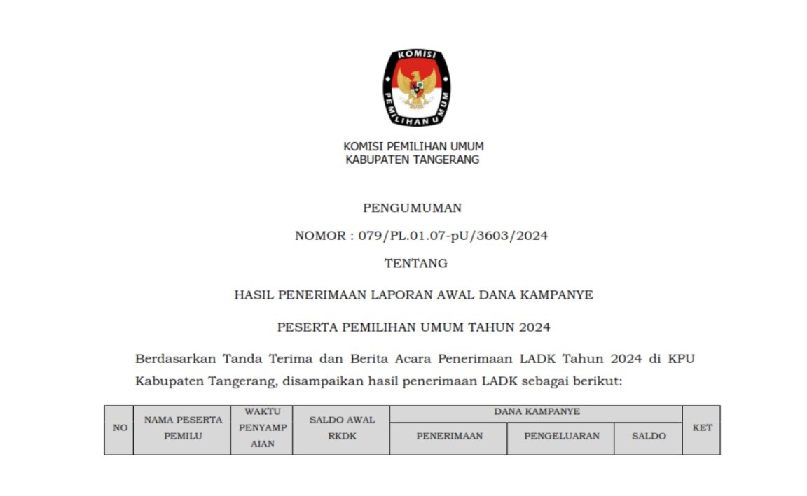 Pengumuman dan Lampiran Hasil Penerimaan Laporan Awal Dana Kampanye (LADK)