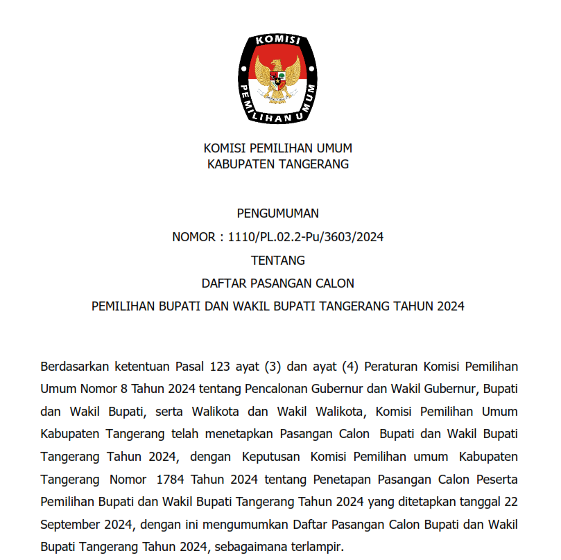 Pengumuman DPC Pemilihan Bupati dan Wakil Bupati Tangerang Tahun 2024