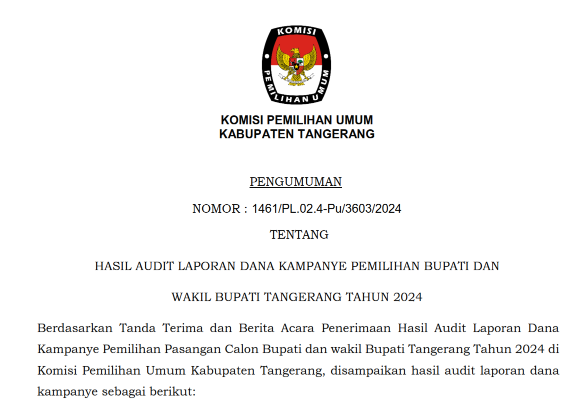 Pengumuman Nomor : 1461/PL.02.4.Pu/3603/2024 tentang Hasil Audit Dana Kampanye Pemilihan Bupati dan Wakil Bupati Tangerang Tahun 2024