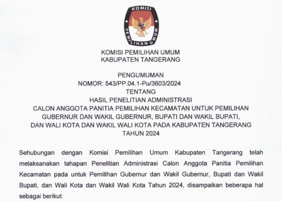 Pengumuman Hasil Seleksi Administrasi Calon Anggota PPK Untuk Pemilihan Gubernur dan Wakil Gubernur, serta Bupati dan Wakil Bupati Kabupaten Tangerang Tahun 2024