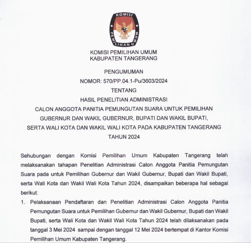Pengumuman Hasil Penelitan Administrasi Calon Anggota PPS Untuk Pemilihan Gubernur dan Wakil Gubernur, serta Bupati dan Wakil Bupati Kabupaten Tangerang Tahun 2024.