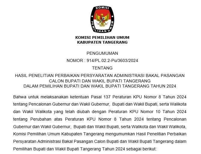 Pengumuman Hasil Penelitian Perbaikan Persyaratan Administrasi Bakal Pasangan Calon Bupati dan Wakil Bupati Tangerang dalam Pemilihan Bupati dan Wakil Bupati Tangerang Tahun 2024
