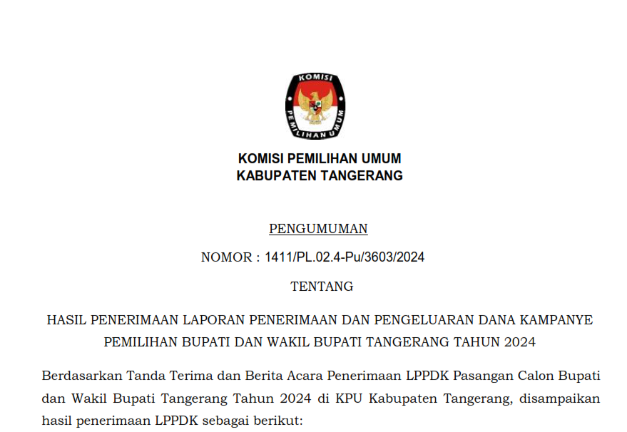 Pengumuman Hasil Penerimaan dan Pengeluaran Dana Kampanya Pilkada 2024