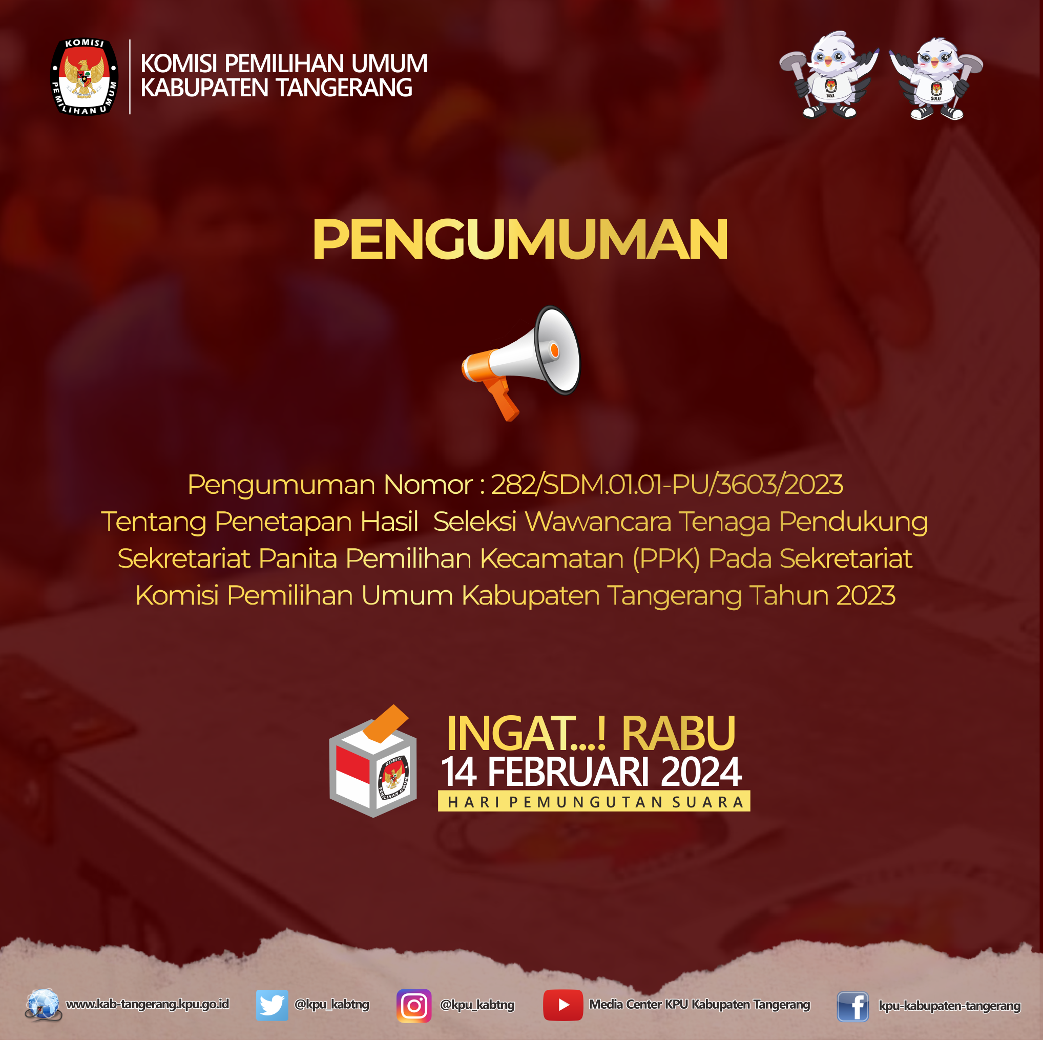 Pengumuman Nomor : 282/SDM.01.01-PU/3603/2023 Tentang Penetapan Hasil Seleksi Wawancara Tenaga Pendukung Sekretariat Panita Pemilihan Kecamatan (PPK) Pada Sekretariat Komisi Pemilihan Umum Kabupaten Tangerang Tahun 2023