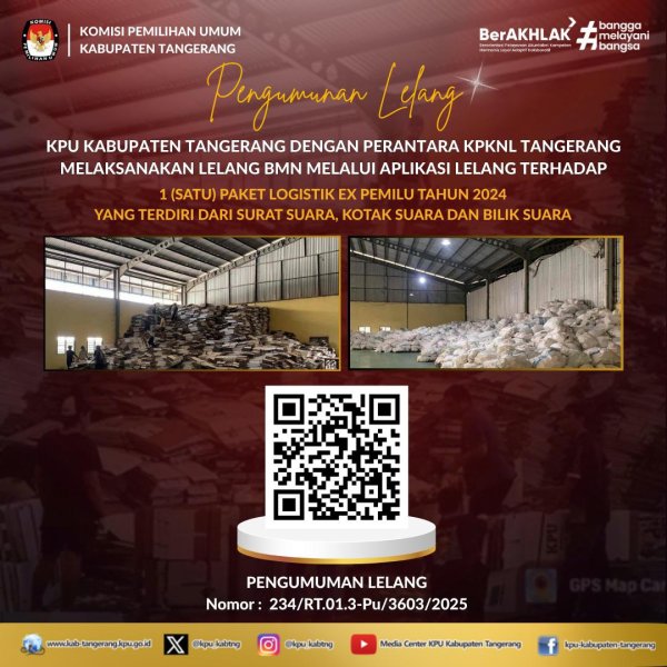 Berdasarkan Persetujuan Penjualan Barang Milik Negara Nomor 1463/RT.01.3-SD/05/2025 Tanggal 29 April 2025 dan Surat Penetapan Jadwal Lelang Nomor JL-706/1/KNL.0603/2025 tanggal 28 Mei 2025 Kantor KPU Kabupaten Tangerang dengan perantara Kantor Pelayanan Kekayaan Negara dan Lelang (KPKNL) Tangerang II, akan melaksanakan Lelang Barang Milik Negara (BMN) melalui Aplikasi Lelang (Open bidding) melalui internet (tanpa kehadiran peserta) terhadap objek/barang.