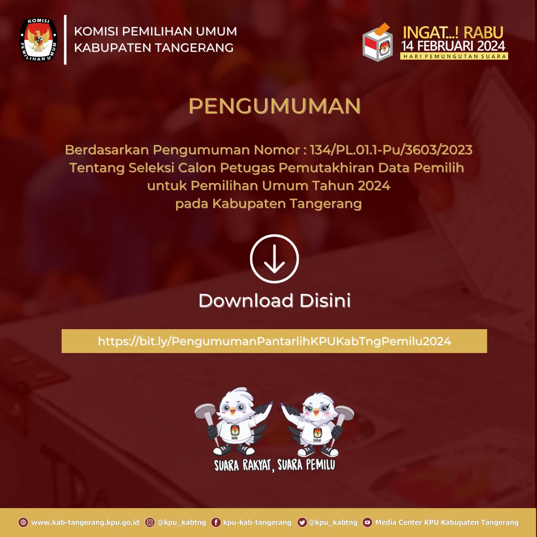 Pengumuman Nomor : 134/PL.01.1-Pu/3603/2023 Tentang Seleksi Calon Petugas Pemutakhiran Daftar Pemilih untuk Pemilihan Umum Tahun 2024 pada Kabupaten Tangerang