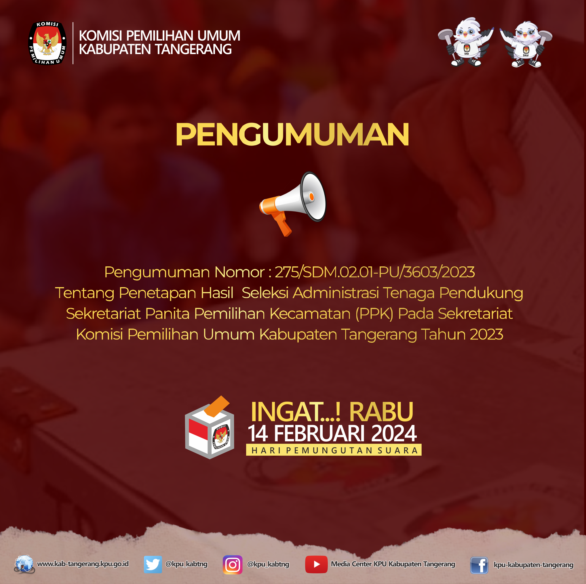 Pengumuman Penetapan Hasil Seleksi Administrasi Tenaga Pendukung Sekretariat Panita Pemilihan Kecamatan (PPK) Pada Sekretariat Komisi Pemilihan Umum Kabupaten Tangerang Tahun 2023