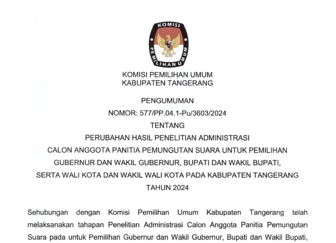 Pengumuman Hasil Penelitan Administrasi Calon Anggota PPS Untuk Pemilihan Gubernur dan Wakil Gubernur, serta Bupati dan Wakil Bupati Kabupaten Tangerang Tahun 2024.