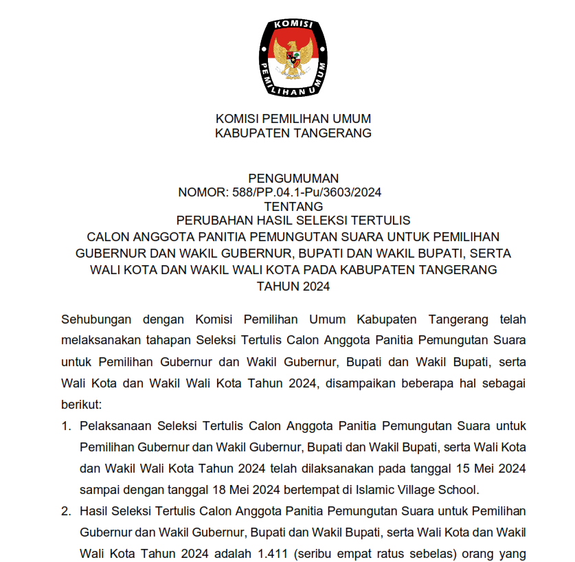 Pengumuman Perubahan Hasil Seleksi Tertulis Calon Anggota Panitia Pemungutan Suara (PPS) Untuk Pemilihan Gubernur dan Wakil Gubernur, Bupati dan Wakil Bupati, Walikota dan Wakil Walikota pada Kabupaten Tangerang Tahun 2024