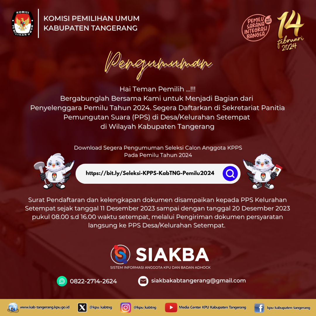 Pengumuman Seleksi Calon KPPS Pada Pemilu Tahun 2024 Senin, 11 Desember 2023 00:00 910 Untuk Mengunduh Pengumuman Seleksi Kelompok Penyelenggara Pemungutan Suara (KPPS) pada Pemilu Tahun 2024 Pengumuman Download Disini Dokumen Persyaratan : Disini Bagikan: Dilihat 910 Kali.