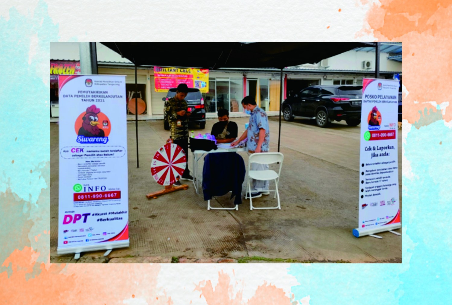 Cisoka, (ww.kab-tangerang.kpu.go.id) - Dalam rangka mensosialisasikan pemutakhiran data pemilih sekaligus memperkenalkan Siwareng (Aplikasi Whatsapp Responsif Tangerang) kepada masyarakat Kabupaten Tangerang, KPU Kabupaten Tangerang membuka posko Daftar Pemilih Berkelanjutan (DPB) yang berlokasi di Pasar Cisoka - Kecamatan Cisoka pada Kamis dan Jumat 18-19 November 2021.