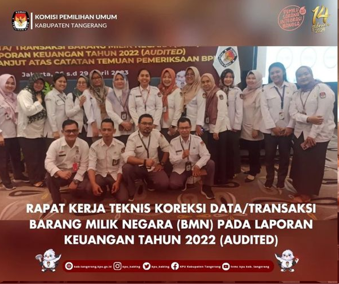 KPU Kabupaten Tangerang yang hadir dalam kegiatan tersebut telah melakukan koreksi data BMN untuk penyusunan Laporan Keuangan Tahun 2022 (Audited) Sebagai Tindak Lanjut atas Catatan Temuan Pemeriksaan BPK RI. (Humas KPU Kabupaten Tangerang)