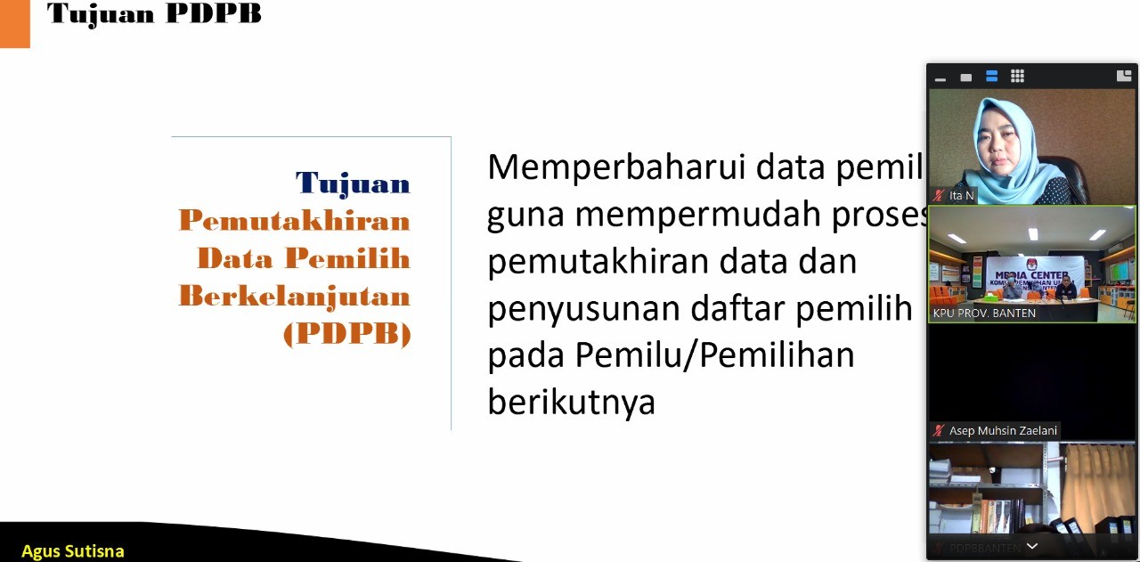 Serang – (www.kab-tangerang.kpu.go.id) – (KPU) Komisi Pemilihan Umum Provinsi Banten bersama seluruh KPU Kabupaten/Kota se-Banten menggelar kegiatan Rapat Koordinasi dan rekapitulasi Data Pemilih Berkelanjutan periode Triwulan I (Januari-Maret) 2021 melalui aplikasi Zoom Meeting, Selasa, (6 April 2021).