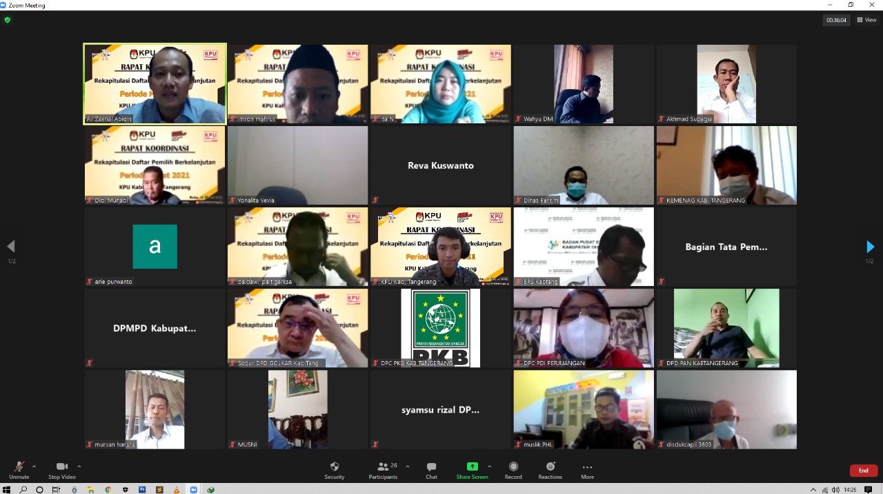 Rapat koordinasi dilaksanakan secara online dengan menggunakan zoom meeting yang dihadiri oleh KPU Provinsi Banten, Badan Pengawas Pemilu Kabupaten Tangerang, Dinas Kependudukan dan Pencatatan Sipil Kabupaten Tangerang, Pimpinan Partai Politik se-Kabupaten Tangerang, Komisioner KPU Kabupaten Tangerang, Sekretaris, Kepala Subbagian dilingkungan KPU kabupaten Tangerang dan Staf Sub bagian Program dan Data, Ketua Pengadilan Agama Tigaraksa, Kepala Badan Pusat Statistik Kabupaten Tangerang, serta Kepala Bagian Pemerintah Umum Kabupaten Tangerang.