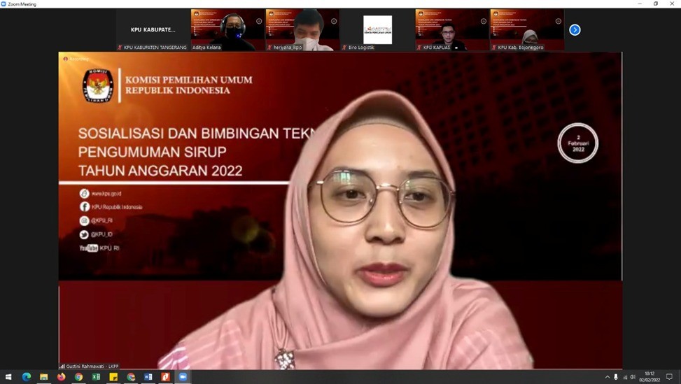 Tigaraksa, (www.kab-tangerang.kpu.go.id) - KPU Kabupaten Tangerang menghadiri undangan dari KPU RI mengenai Sosialisasi dan Bimbingan Teknis Pengumuman SIRUP Tahun Anggaran 2022 melalui media daring dengan mengundang Sekretaris KPU Provinsi, Sekretaris KPU Kabupaten/Kota, Pejabat Pembuat Komitmen dan Pejabat Pengadaan di lingkungan Sekretariat KPU se-Indonesia pada Rabu (02/02/2022).
