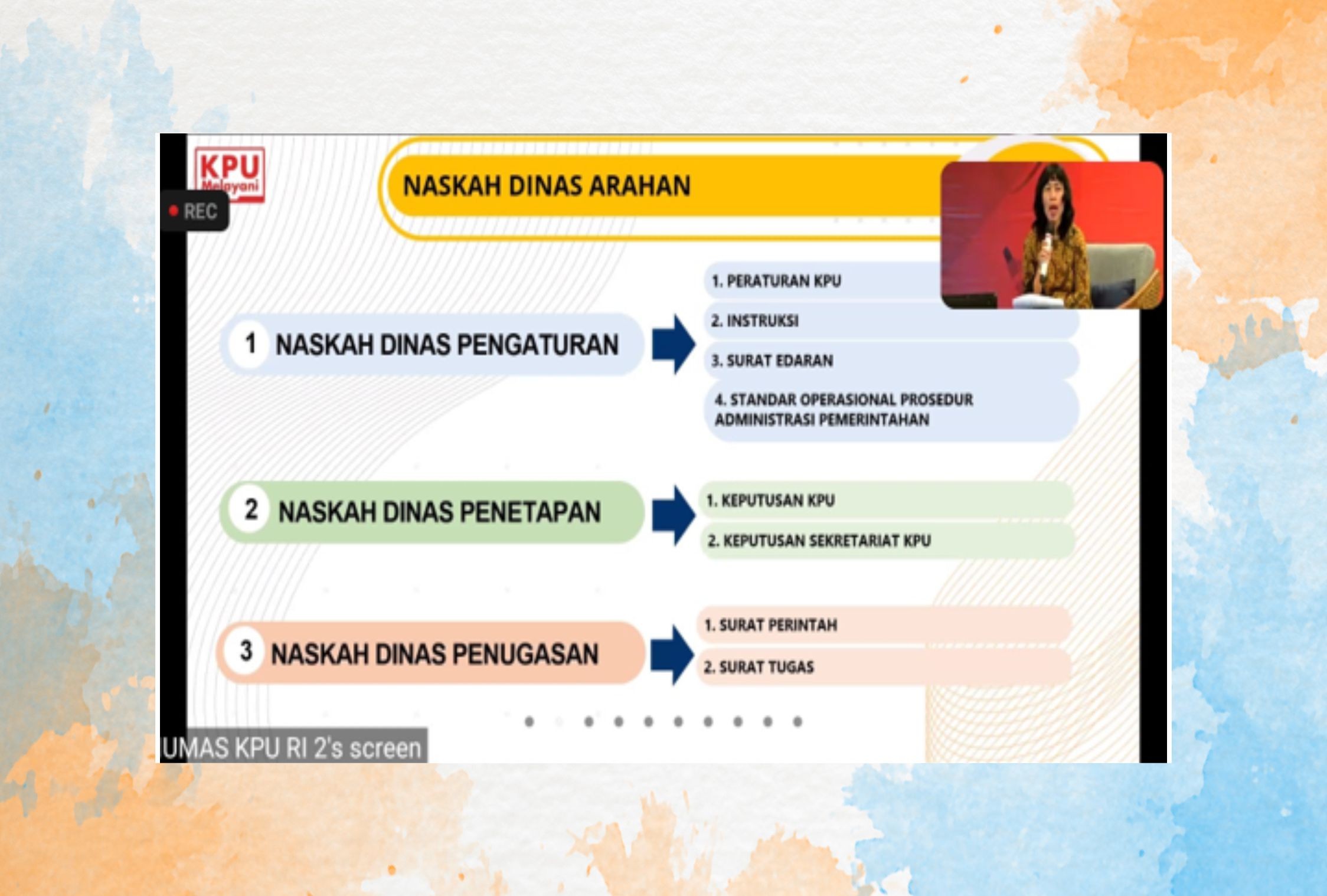 Kegiatan tersebut dilanjutkan dengan pemberian materi oleh Kepala Biro Perundang-undangan KPU RI Nur Syarifah yang menyampaikan materi tentang tata naskah dinas PKPU Nomor 2 tahun 2021, sesi selanjutnya diisi oleh Kepala Biro Umum M Syahrizal Iskandar dengan materi Implementasi Tata Naskah Dinas di lingkungan KPU RI, KPU Provinsi dan KPU Kabupaten/Kota, kemudian Narasumber dari ANRI yang menyampaikan materi Sosialisasi penataan dan penyusutan Arsip, Narasumber selanjutnya yaitu Sekretariat Negara dengan materi Etika Pelayanan Tata Usaha Pimpinan dan Narasumber terakir yaitu dari ANRI dengan materi Pengenalan Aplikasi Srikandi. - (Humas KPU Kabupaten Tangerang)