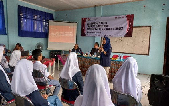 Cisoka, (www.kab-tangerang.kpu.go.id) – Anggota KPU Kabupaten Tangerang, Ita Nurhayati bersama Anggota Bawaslu KPU Kabupaten Tangerang, Dzulfikar menjadi narasumber pada kegiatan “KPU Goes to School” di SMK Gema Bangsa, Cisoka, Kabupaten Tangerang. Selasa, (13/9/2022).