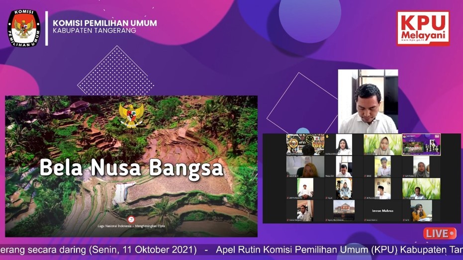 Tigaraksa, (www.kab-tangerang.kpu.go.id) - Apel pagi setiap hari Senin rutin dilaksanakan di lingkungan Komisi Pemilihan Umum Kabupaten Tangerang. Seperti halnya pagi ini, Senin 11 Oktober 2021 KPU Kabupaten Tangerang mengadakan apel pagi, kali ini apel dilaksanakan secara daring via Zoom Meeting, apel diikuti oleh seluruh staff sekretariat, dimulai pada pukul 07.30 WIB. Sebagai Pembina apel kali ini adalah Wahyu Diana Mulya selaku Komisioner KPU Kabupaten Tangerang.
