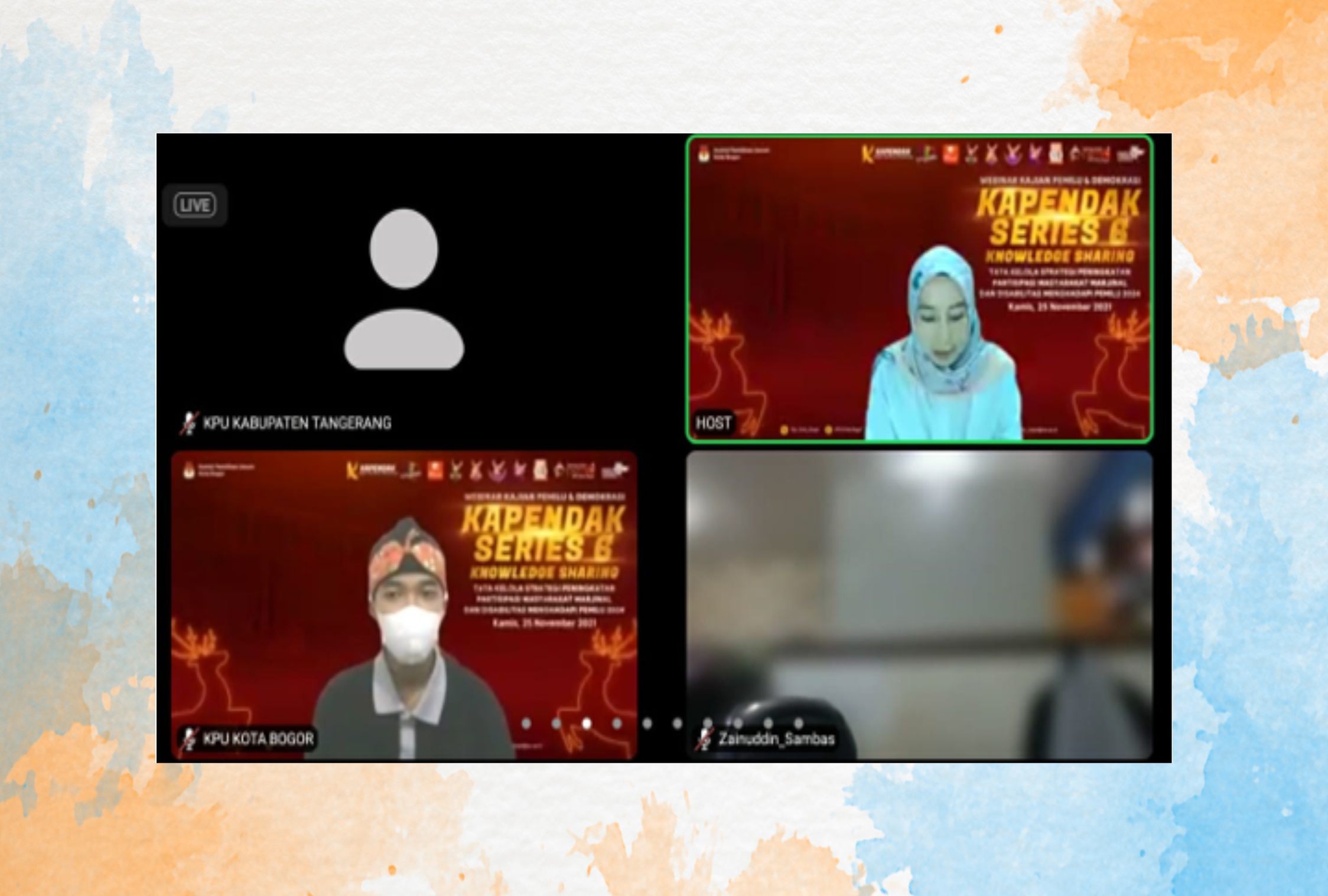 Tigaraksa, (www.kab-tangerang.kpu.go.id) - Dalam rangka peningkatan kapasitas penyelenggara serta sosialisasi pendidikan pemilih dan partisipasi masyarakat pada Pemilu dan Pemilihan Tahun 2024, KPU Kabupaten Tangerang menghadiri undangan Webinar Kajian Pemilu dan Demokrasi bersama KPU Kota Bogor yang disiarkan melalui zoom meeting dan live streaming di Youtube KPU Kota Bogor pada Kamis (25/11/2021).